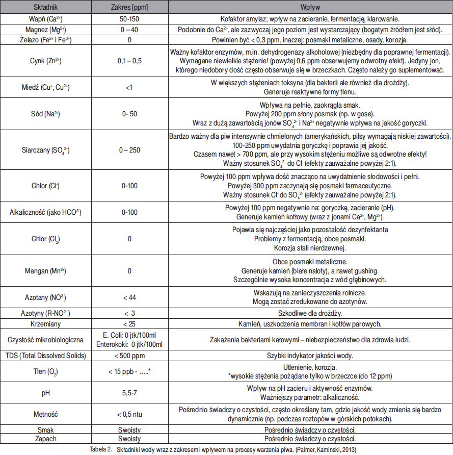 Bez względu na wielkość browaru, wodę powinniśmy badać. Jak już wspomniałem, raz do roku należy wykonać pełne badania wody na potrzeby sanepidu. Niemniej jednak w browarze woda powinna być badana jak najczęściej oczywiście zakres i metody dobieramy adekwatnie do rozmiaru browaru i potrzeb jakie mamy. Pamiętajmy, że badaniem możemy nazwać również próbowanie wody, szczególnie jeśli wykona to przeszkolona osoba i sporządzone zostaną z tego odpowiednie zapiski. (Tab 3.) Pomocne mogą okazać się też raporty publikowane przez wodociągi, które dostarczają nam wodę – powinny być udostępniane na ich stronach internetowych. Niestety nie będą one pokrywać się w pełni z jakością wody w naszym browarze – bardzo duże znaczenia ma jeszcze infrastruktura, którą woda jest przesyłana.