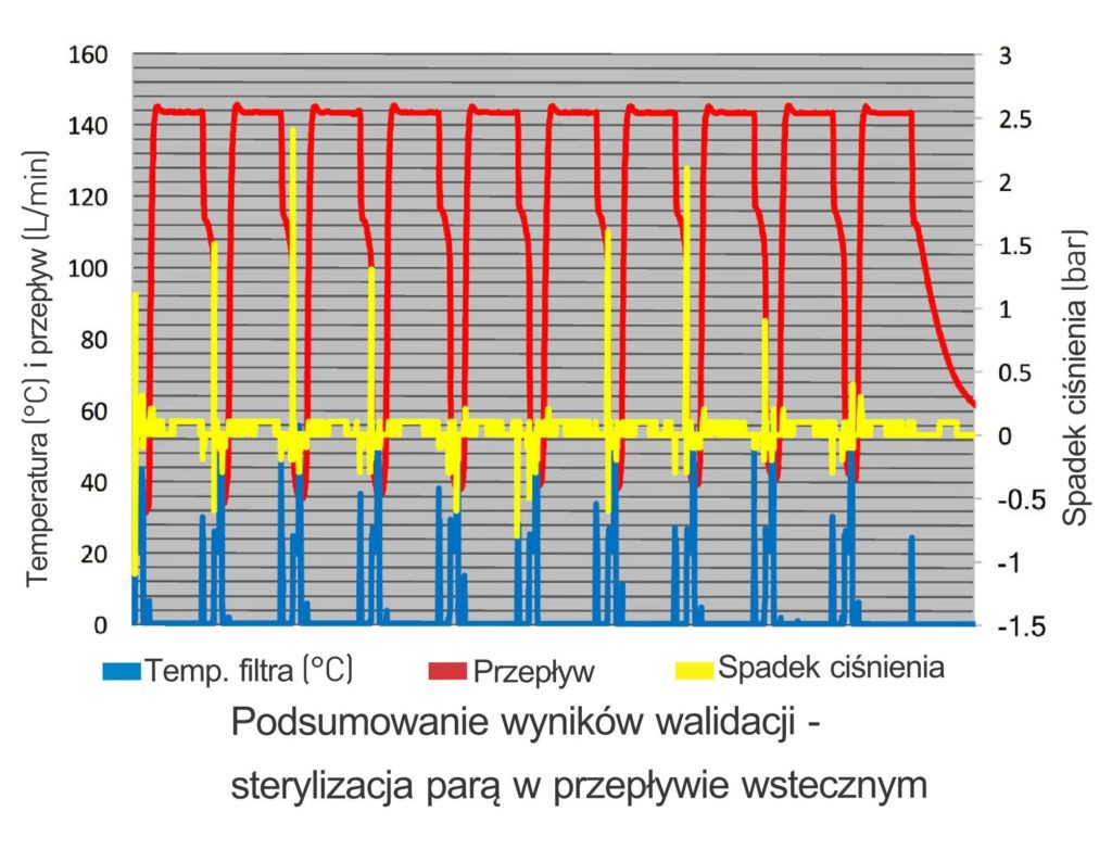 Filtry ASEPT-X zostały zaprojektowane, by wytrzymać regularne cykle sterylizacji bez konieczności odprowadzania kondensatu, który uszkodziłby inne filtry, chyba że proces byłby bardzo ściśle kontrolowany. ASEPT-X zostały zwalidowane pod kątem wytrzymałości na agresywne warunki temperatury i ciśnienia, które występują w praktyce przemysłowej. By zweryfikować zdolność do przetrwania agresywnych cykli SIP, kilka partii filtrów zostało poddane 30-minutowym cyklom w specjalnych instalacjach testowych, w przepływie współprądowym i wstecznym, bez udziału drenów kondensatu. Integralność filtrów została zbadana przed i po teście przy użyciu urządzenia do testów integralności Valairdata. ASEPT-X zostały zwalidowane na 100 cykli sterylizacji parą w przepływie wstecznym. Wyniki testów przewyższają jakiekolwiek inne dostępne filtry.