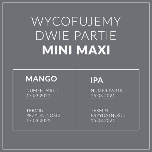 Browar Pinta informuje o wycofaniu ze sprzedaży dwóch partii piwa: Mini Maxi Mango (numer partii: 17.03.2021) i Mini Maxi IPA (numer partii: 15.03.2021). Powodem jest przegazowanie piwa.