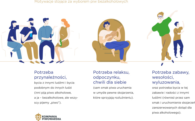 Warto zwrócić uwagę, że odsetek mężczyzn pijących piwo 0,0% jest znaczący, podczas gdy kilka lat temu było ono kojarzone z kobietami i postrzegane jako „mało męskie”. Wśród osób sięgających po piwa bez procentów można wyróżnić grupę ludzi dorosłych i dojrzałych – takich, którzy wiedzą, czego chcą od życia, podejmują odpowiedzialne decyzje, nie ulegając presji otoczenia; aktywnych, żyjących szybko, którym piwo bezalkoholowe pomaga godzić wiele ról i potrzeb, „nadążyć” za swoim życiem; poważnych i zaangażowanych w pracę, szczególnie taką, która wymaga skupienia, precyzji, wiąże się z dużą odpowiedzialnością; wreszcie aktywnych fizycznie, które rezygnują z alkoholu z powodu treningów lub diety. Badani deklarowali, że piwa bezalkoholowe wybierają dla przyjemności (73%), z konieczności – ponieważ nie mogą spożywać alkoholu (55%) i dlatego, że stanowią one zdrowszy wybór (56%). Te statystyki dobrze obrazują zmiany, jakie zaszły w postawach konsumentów w ciągu ostatnich lat. Motywacja piwoszy dotycząca piw bezalkoholowych przesuwa się bowiem z „muszę” w kierunku „chcę”; z niechętnego poddania się konieczności w stronę podjęcia satysfakcjonującej decyzji.