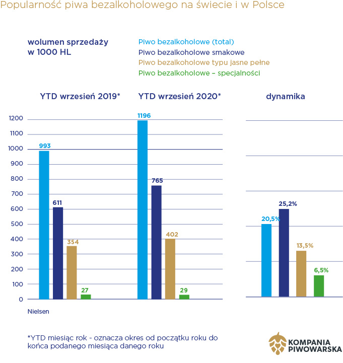 Piwo bezalkoholowe stanowi obecnie 5,9% rynku piwnego w Polsce pod względem wartości i 4,9% pod względem wolumenu. Może się wydawać, że to niewiele, jednak segment ten już od dłuższego czasu notuje dynamiczny, dwucyfrowy wzrost – w 2019 r. ponad 60% , w 2020 r. 20,5% – spadek spowodowany pandemią. W czasie pierwszych trzech kwartałów bieżącego roku wydatki na piwo bezalkoholowe w naszym kraju wyniosły 823 mln zł (wg Nielsen).