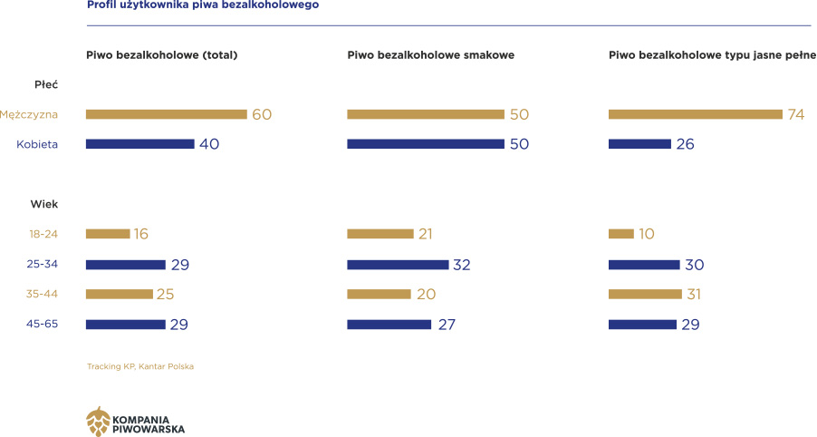 Wraz ze spożyciem zwiększa się grupa konsumentów „zerówek”: w 2019 r. sięgało po nie już 57% dorosłych Polaków (w 2018 – 47%), 46% piwoszy piło je przynajmniej raz w miesiącu (w 2018 – 38%), a tylko 24% nigdy (w 2018 – 33%). Wśród osób pijących piwo bez procentów przeważają mężczyźni (60%), choć nie w sposób tak zdecydowany jak w przypadku piw zawierających alkohol (65%). NAB-y mają też więcej amatorów w młodszych grupach wiekowych – wybiera je 51% osób do 35. roku życia (dla porównania – piwo alkoholowe pije 41%). Półka piw niezawierających alkoholu również staje się coraz bardziej obszerna i różnorodna. Dzisiaj konsumenci mogą wybierać spośród bezalkoholowych odpowiedników lagerów, piw smakowych i specjalności, które stanowią odpowiednio 64%, 34% i 2% segmentu (2020 r.).