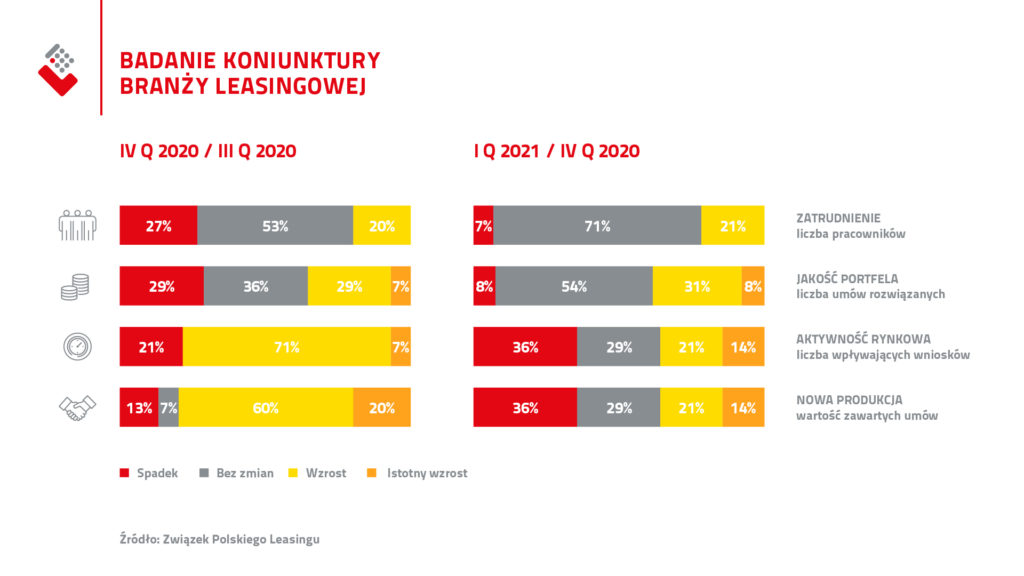 Wśród pozytywnych informacji, warto podkreślić dodatni wynik całego aktywnego portfela branży leasingowej na koniec 2020r. (+0,1 % r/r). W przypadku portfela ograniczonego do finansowania aktywów ruchomych dynamika wzrostu wynosi +0,2 % r/r.