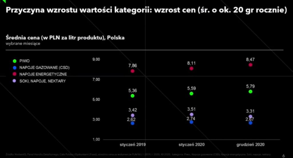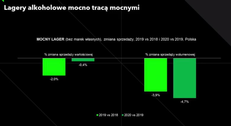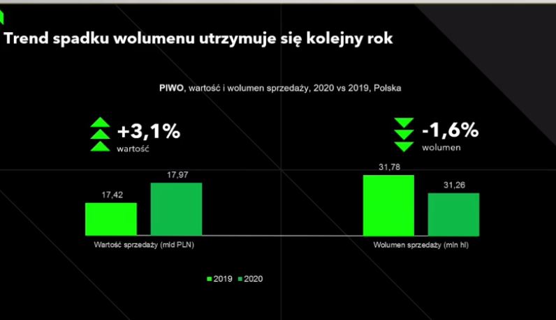 Polacy w 2019 roku kupili mniej piwa, ale o większej wartości. Równocześnie ubywa na rynku piw mocnych i dynamicznie rozwijają się piwa niskoalkoholowe oraz piwne specjalności, które są pozycjonowane wyżej. Wzrost wartości spowodowany jest również inflacją – piwo systematycznie drożeje, średnio 20 groszy na litrze rocznie.
