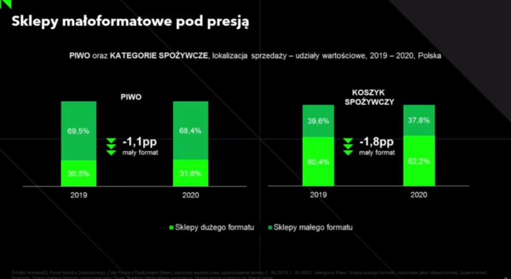 Czas lockdownu zmienił też zachowania konsumenckie, także w handlu piwem. Wprawdzie sklepy małoformatowe nadal odpowiadają za 2/3 sprzedaży tego trunku, jednak ich udział w tym dziwnym czasie – nieco spadł.