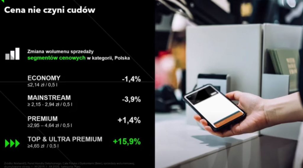 Pomimo pandemii, a być może właśnie z jej powodu, Polacy często wybierali piwa klasy premium. Piwa w cenie 4,65 zł i droższe zanotowały prawie 16% dynamikę wzrostu.