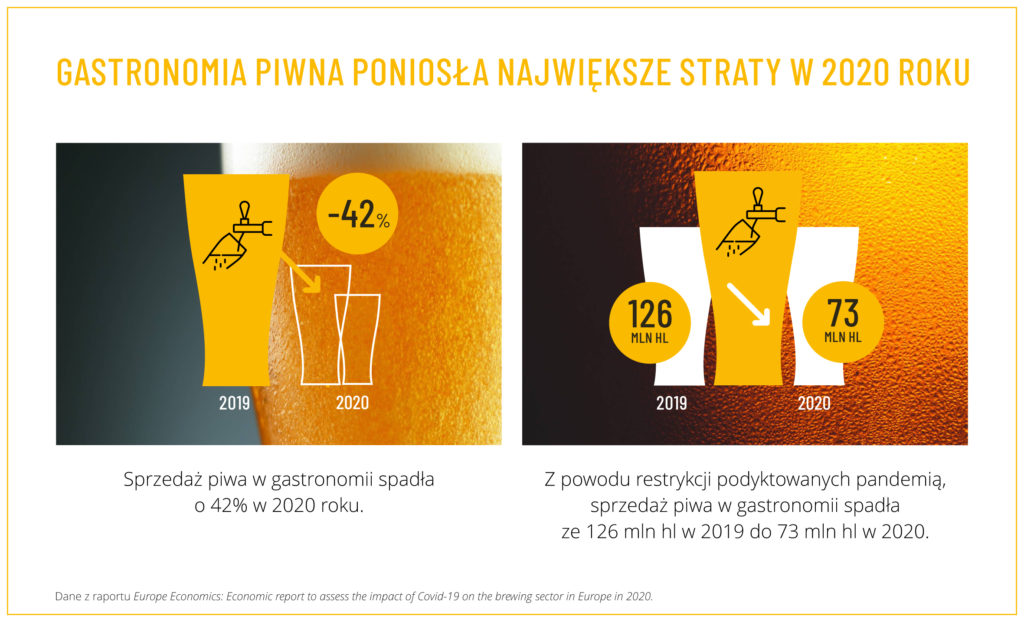 Lokale gastronomiczne są ważnym partnerem również dla polskiej branży piwowarskiej. Pozostawały całkowicie zamknięte przez dwa wiosenne miesiące 2020 roku, otwarte dla klientów w okresie wakacyjnym, by jesienią znów zamknąć swe drzwi dla gości, zachowując jednie możliwość sprzedaży z dostawą. Ta nie objęła jednak napojów alkoholowych. W pierwszym kwartale 2021 r. doszło do sytuacji bezprecedensowej, kiedy to sprzedaż piwa w beczkach spadła o 100% w ujęciu rok do roku.