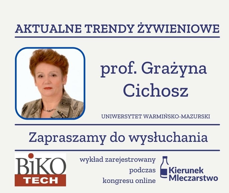 Aktualne trendy żywieniowe Zapraszamy do wysłuchania wystąpienia prof. Grażyny Cichosz podczas kongresu Kierunek Mleczarstwo, który odbył się na platformie konferencyjnej firmy Bikotech w terminie 24-25 maja 2021 r. Relacja z całego wydarzenia: Kierunek MLECZARSTWO online – nasza relacja