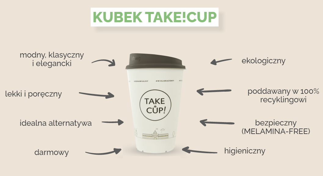 Cały pomysł przypomina sprytny StartUp. Opiera się on na trendzie proekologicznym i trosce o środowisko. Twórcy kubków wielorazowego użycia podają, że ludzkość zużywa rocznie 3 miliardy kubków jednorazowych. – Średni czas w jakim kubek, od momentu podania kawy, trafi do śmietnika to około 15 minut – argumentują na swojej stronie. To problem, na który proponują rozwiązanie: jeden kubek Take!Cup zastępuje aż do 1000 kubków papierowych.