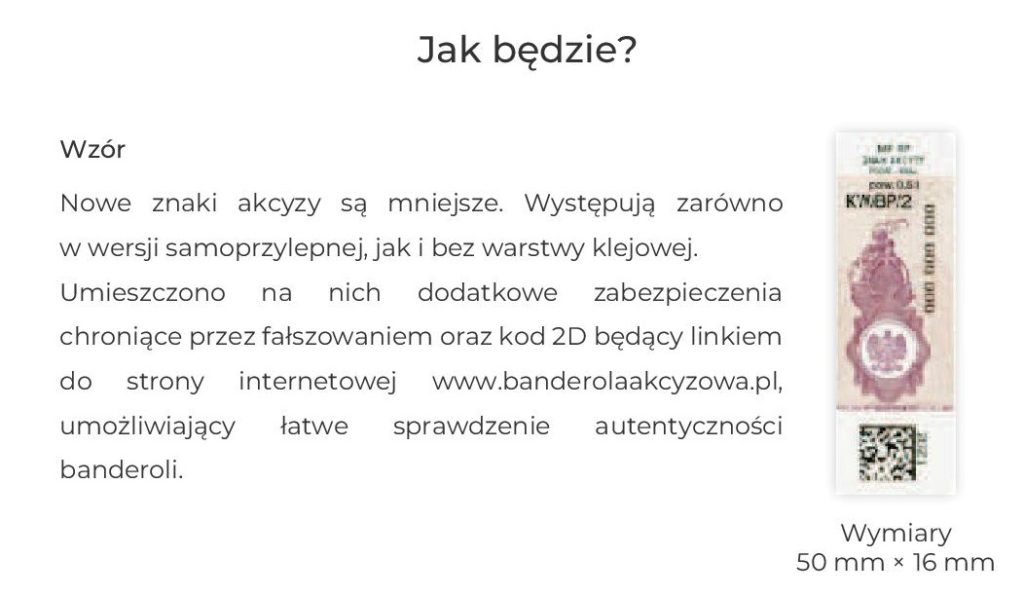 Co ciekawe i ważne również dla konsumentów, nowe banderole będą zaopatrzone w kod 2D, będący linkiem do strony www.banderolaakcyzowa.pl, umożliwiający łatwe sprawdzenie autentyczności znaku, a zatem legalności produktu.
