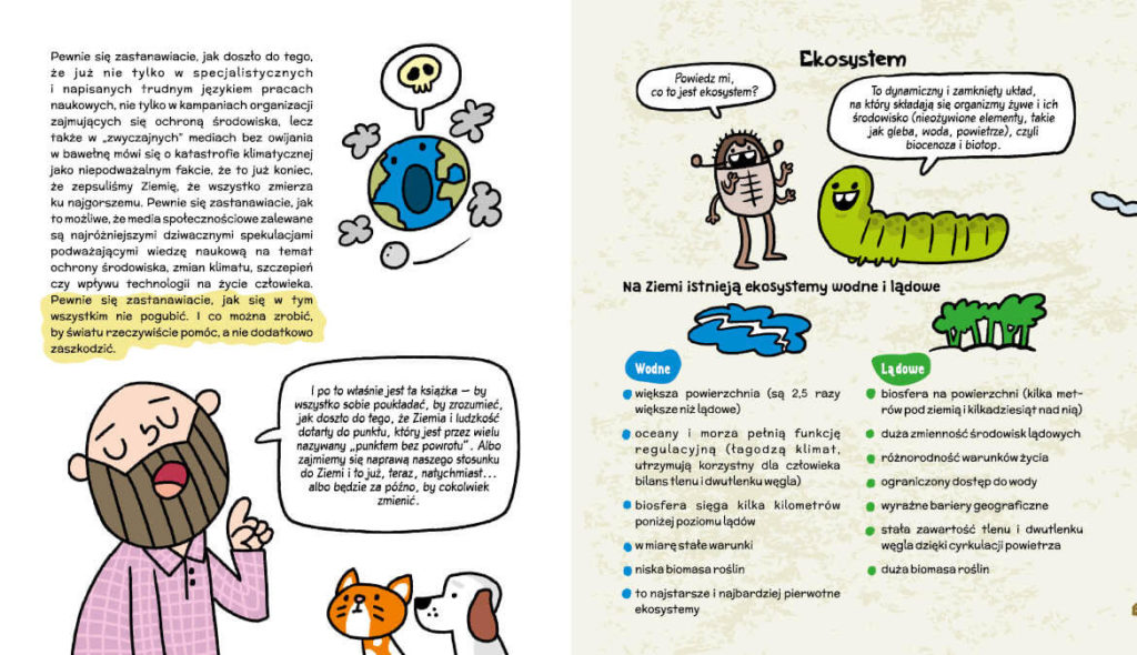 Publikacja w ciekawy, przystępny, a jednocześnie ambitny sposób przybliża dzieciom i młodzieży szkolnej zagadnienia z zakresu ekologii, biologii, zmian klimatycznych czy szeroko rozumianej ochrony środowiska. Na bazie rysunków, schematów, infografik czy komiksów objaśnia zagadnienia i podpowiada, jak małymi krokami i we własnym zakresie można pozytywnie wpływać na otoczenie.