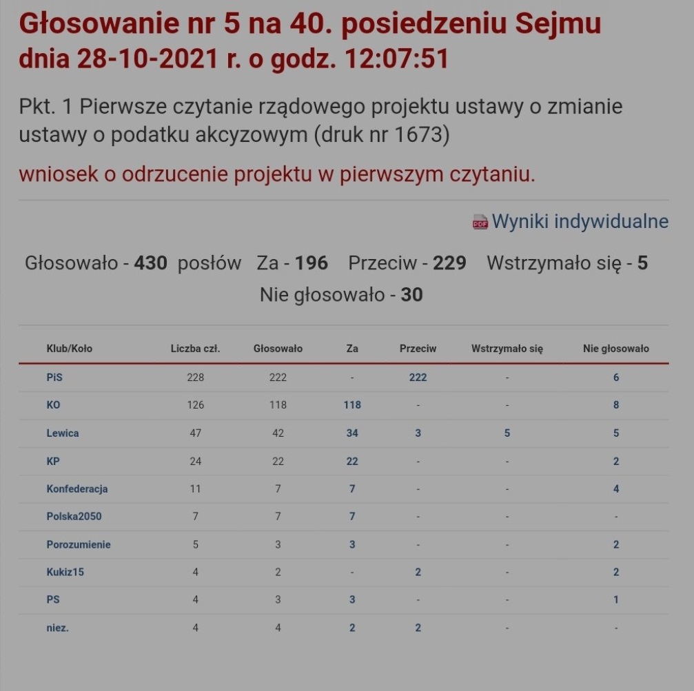 W czwartek (28.10.2021) Sejm odrzucił wniosek o odrzuceniu projektu ustawy dot. podwyżki akcyzy, oznacza to dalszy proces legislacyjny i realne zagrożenie wejścia podwyżek w życie od stycznia 2022.