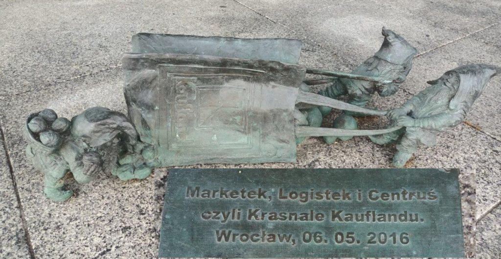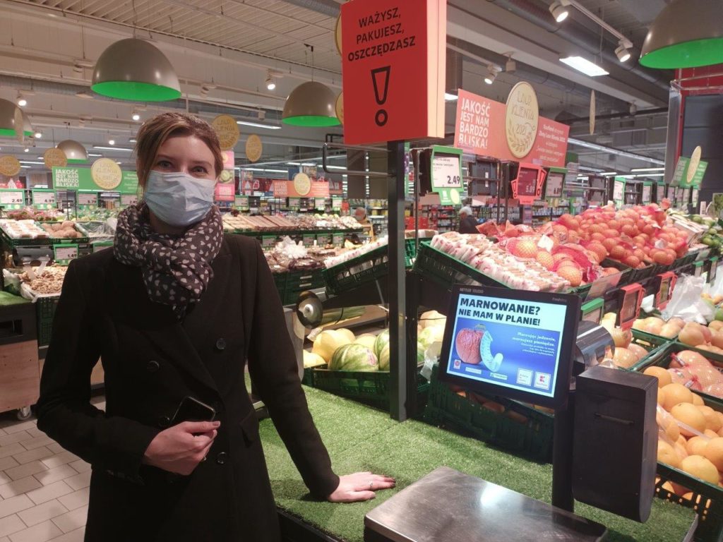 Ciepło odpadowe powstające przy pracy lodówek w sklepach sieci Kaufland zawracane jest do systemu, aby wspomagać ogrzewanie podłogowe, z kolei chłód pochodzący z pomp ciepła wykorzystywany jest do klimatyzacji pomieszczeń.Kaufland jest też gotowy do instalacji stacji ładowania samochodów elektrycznych, jeśli taka potrzeba się pojawi.Postępująca digitalizacja sprzedaży to nie tylko kasy samoobsługowe (SCO), których pracuje na razie 778, ale cały system, łącznie z etykietami ESL i nowym systemem kasowym K-pos. System ułatwi pracę kasjerom, jako bonus pojawi się także opcja zatrzymania paragonu i obsługi w międzyczasie kolejnego klienta.Jak każda szanująca się sieć, również Kaufland dostosowuje się do nowych wymagań legislacyjnych oraz komunikuje swoje działania prośrodowiskowe.Dbałość o duży asortyment produktów regionalnych, w tym piw, to oczko w głowie tutejszych szefów sprzedażyMaja Szewczyk, szefowa działu komunikacji, prezentuje system zachęcający konsumentów do niemarnowania żywnościKaufland, jak każda szanująca się wrocławska firma, ma przed swoją siedzibą własne, wrocławskie krasnale.