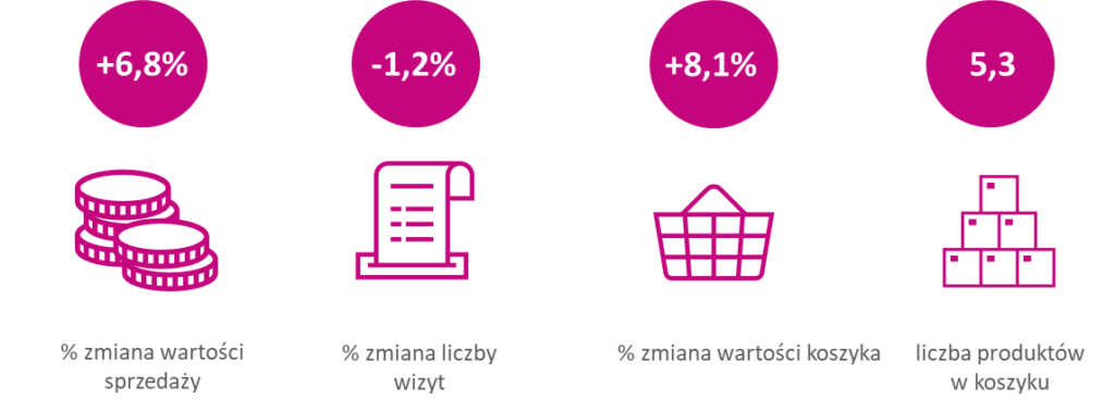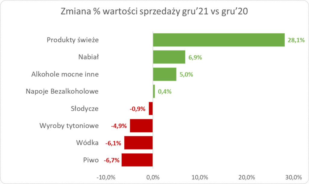 Za blisko 7% wzrostem wartości sprzedaży stały produkty świeże na wagę (mięsa, wędliny, warzywa, owoce, sery itd.), których łączna wartość sprzedaży wzrosła rok do roku o nieco ponad 28%. Ponadto wzrosła wartość sprzedaży nabiału (+6,9%) czy alkoholi mocnych typu whisky, rum, gin czy likiery (+5,0%). Spadki tradycyjnie już towarzyszyły takim używkom, jak piwo (-6,7%), wódka (-6,1%) oraz wyroby tytoniowe (-4,9%).