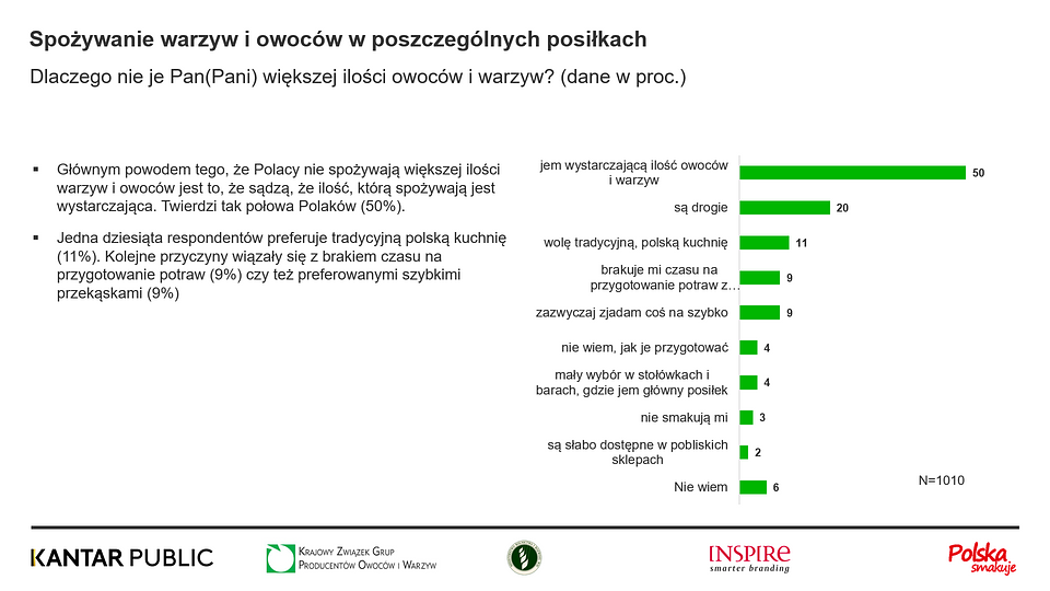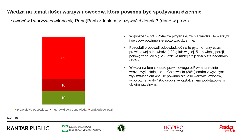 Brak wiedzy, o tym, że warzyw i owoce powinny stanowić połowę tego co jemy, jest cały czas główną barierą konsumpcji. Połowa Polaków uważa, że spożywa warzywa i owoce w wystarczającej ilości, a tylko co piąty (19%) je ich tyle ile wskazują rekomendacje specjalistów – dietetyków i lekarzy. Badania zrealizowane po sezonie 2021 potwierdzają, to wokół czego powinniśmy koncentrować zasoby promocyjne. Czas ku temu jest dobry, pandemia podnosi zainteresowanie samą konsumpcją owoców i warzyw, bardzo podniosła też świadomość ich prozdrowotnego znaczenia na talerzu – podsumowuje Witold Boguta, Prezes Krajowego Związku Grup Producentów Owoców i Warzyw.