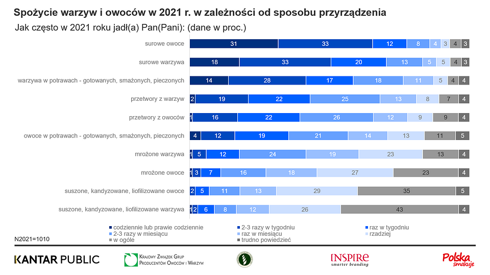 Rośnie konsumpcja mrożonych owoców i soków NFC, przetworów z warzyw i „sałatek”, owoców i warzyw konserwowych i marynowanych. Nie rośną za to deklaracje konsumpcji owoców i warzyw świeżych, co jest najbardziej widoczne w kategorii „jem codziennie lub prawie codziennie”. Dotyczy to praktycznie wszystkich gatunków, głównie owoców.