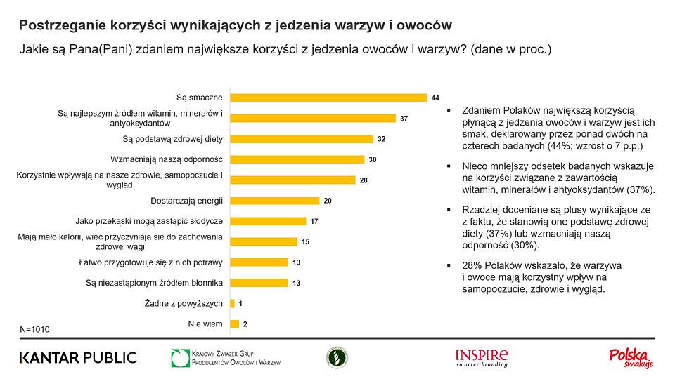 Korzyści wynikających z konsumpcji owoców i warzyw wymienia każdy badany (97%). Postrzegane są jako podstawa zdrowego sposobu odżywania (37%), korzystnie wpływające na formę i nasz wygląd (28%). W pandemii o prawie 50% wzrósł odsetek Polaków, którzy postrzegają owoce i warzywa jako wzmacniające odporność organizmu (wzrost z 21 do 30 p.p. w okresie 2 lat). Znacząco wzrósł też poziom deklaracji „jako przekąski mogą zastąpić słodycze” – wzrost o ponad 100% (z 8 do 17 p.p.).