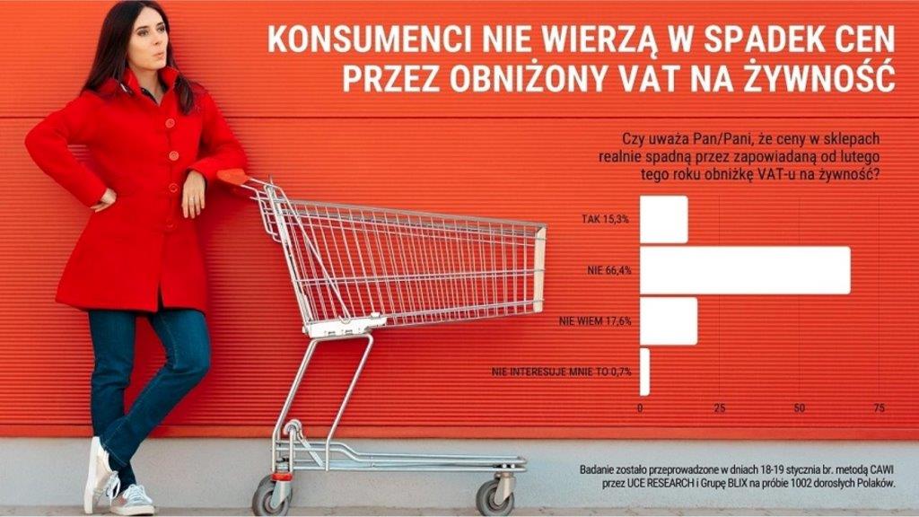 Według sondażu UCE RESEARCH i Grupy BLIX, ponad 66% aktywnych konsumentów uważa, że ceny w sklepach realnie nie zmniejszą się przez zapowiadaną od lutego br. obniżkę VAT-u na żywność. Natomiast ponad 15% respondentów jest przeciwnego zdania. I niewiele więcej osób, bo blisko 18% nie ma wyrobionej opinii w tej sprawie. Z kolei niecałe 1% ankietowanych w ogóle się tym nie interesuje.