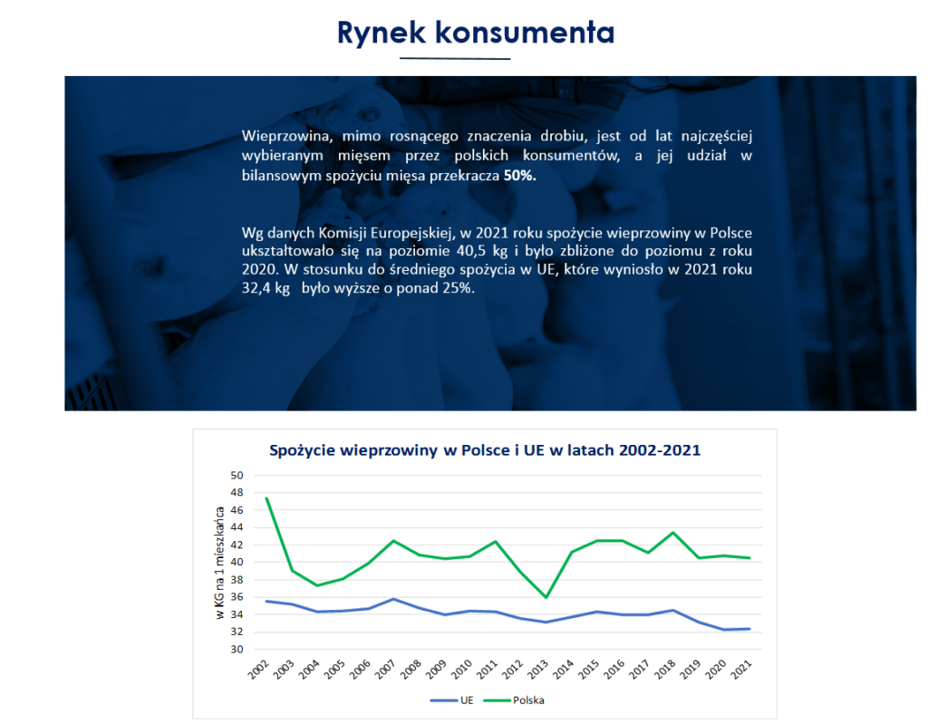 W pierwszym kwartale 2022 roku Chiny wyprodukowały 15,6 mln ton wieprzowiny, co oznacza wzrost o 14% w porównaniu do analogicznego okresu roku ubiegłego. To z kolei przełożyło się na spadek zapotrzebowania na wieprzowinę z UE, a tym samym na spadek eksportu unijnej wieprzowiny do Chin, powodując nadwyżki na rynku unijnym. Ucierpiała na tym między innymi Hiszpania, obecnie największy producent i eksporter trzody chlewnej w Unii Europejskiej. W drugiej połowie 2021 r. Chiny zmniejszyły popyt na tamtejszą wieprzowinę aż o 43%, przy występujących, niewielkich wzrostach w hiszpańskim pogłowiu trzody chlewnej (o 5% do wielkości 33 mln sztuk). Trudna sytuacja jest również w Niemczech. Występujący na jego terytorium wirus ASF skutkuje zakazem eksportu mięsa wieprzowego do Chin oraz Japonii, generując olbrzymie nadwyżki produkcji żywca w tym kraju. W konsekwencji następuje systematyczne zmniejszanie pogłowia trzody chlewnej zarówno w samych Niemczech, jak i w całej Unii Europejskiej.