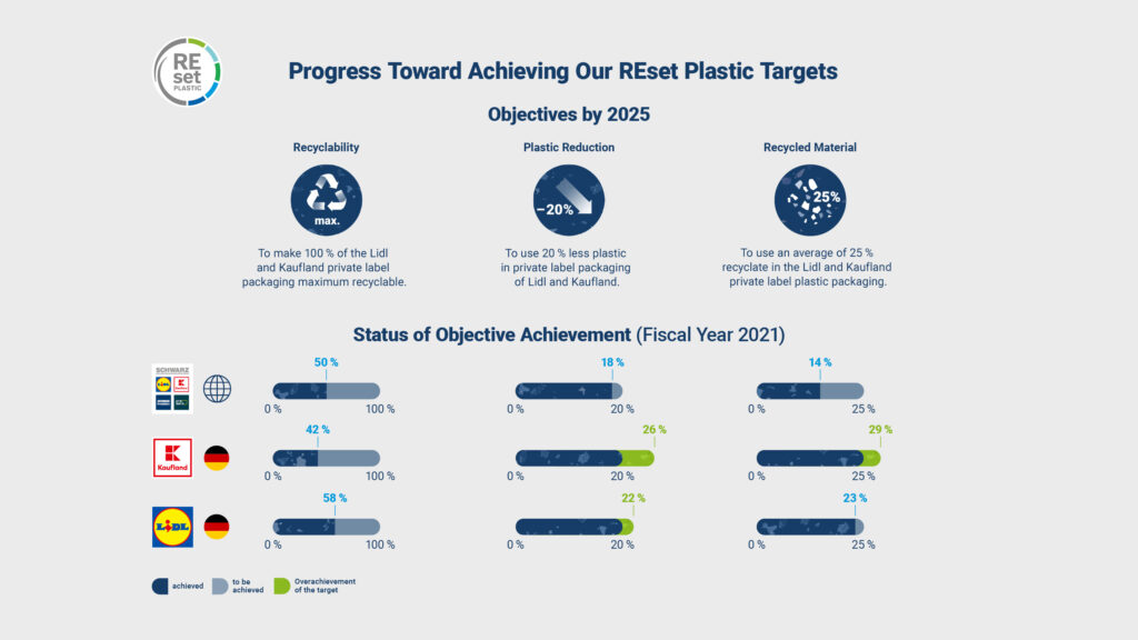 Grupa Schwarz postawiła sobie za cel, aby do 2025 roku wykorzystywać w plastikowych opakowaniach marek własnych (dostępnych w Polsce w Lidlu i Kauflandzie) średnio 25% recyklatu. W Niemczech Kaufland wykorzystuje go już w 29%, a Lidl w 23%. Udało się to osiągnąć w szczególności dzięki butelkom PET, do produkcji których wykorzystano 100% recyklatu (z wyłączeniem nakrętek i etykiet).