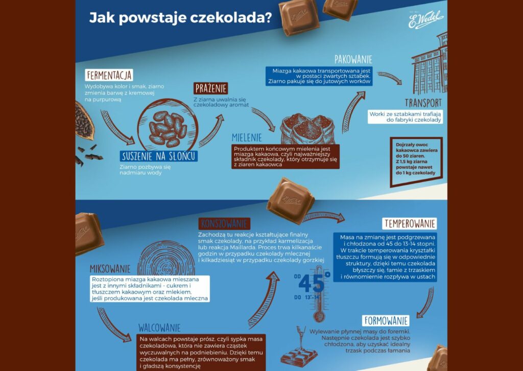 – Dojrzały owoc kakaowca zawiera ponad 50 ziaren, z których po mieleniu powstaje kakao. Z 1,5 kilograma ziarna może powstać nawet 1 kilogram czekolady, której smak zależy w dużej mierze od tego, gdzie kakaowiec był uprawiany. Kraj pochodzenia, warunki klimatyczne, jakość gleby czy odmiana kakaowca są decydujące dla późniejszego smaku i jakości czekolady. Ziarno z Wybrzeża Kości Słoniowej może mieć aromat suchej trawy, z Ekwadoru kwiatów lub cytrusów. Wykorzystywane w naszej produkcji kakao od lat kupujemy z Ghany, ponieważ charakteryzuje się ono głębokim, czekoladowym smakiem, wyróżniającym nasze produkty na tle pozostałych – mówi Ewa Kołodziejczyk, kierowniczka działu R&D – badań i rozwoju w firmie Wedel.