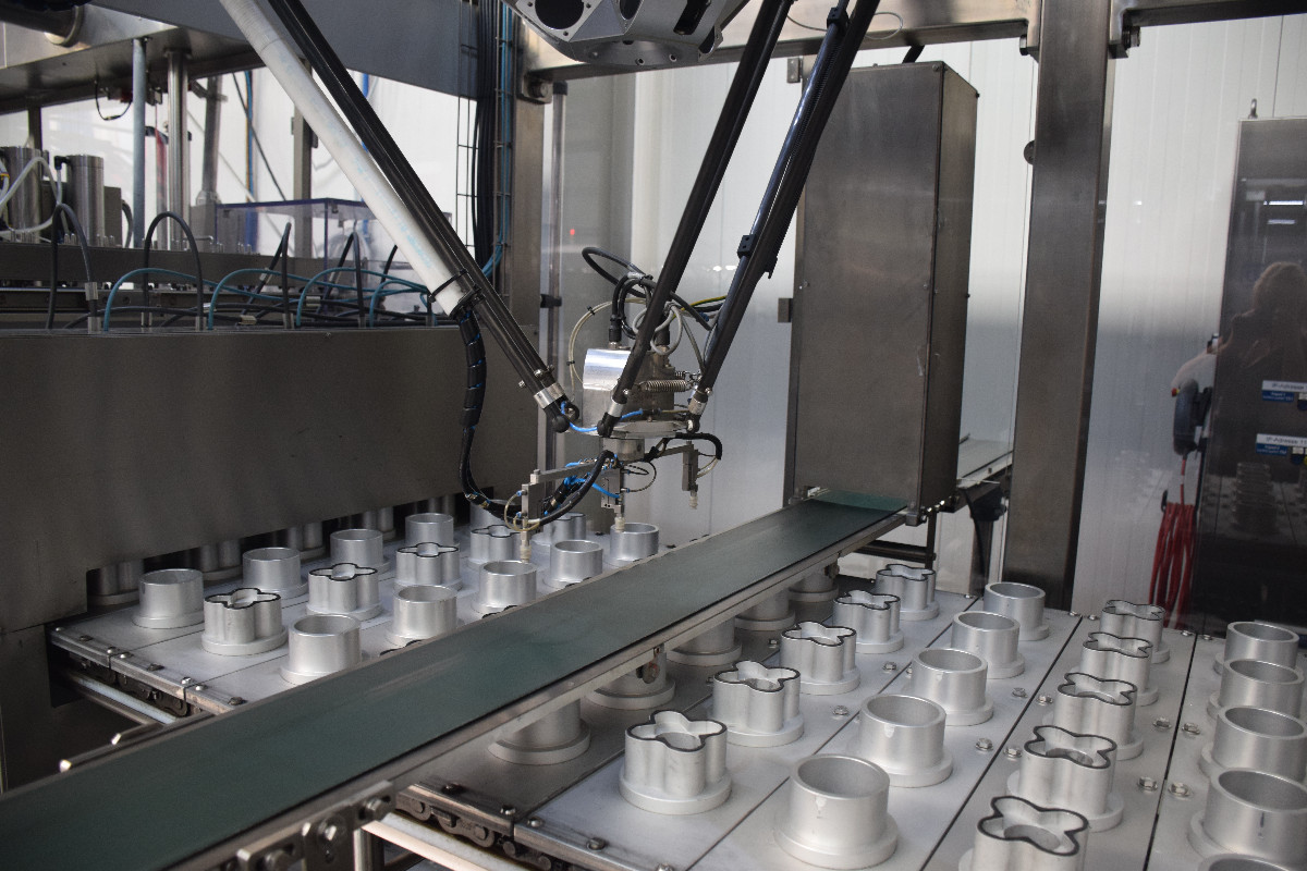 Stacja dozująca Zentis oraz stacja 3XM Marbo zintegrowana z rotacyjnym automatem Trepko do napełniania i zamykania kubków w technologii aseptycznej połączone z urządzeniem do pakowania w kartony typu sleeve.