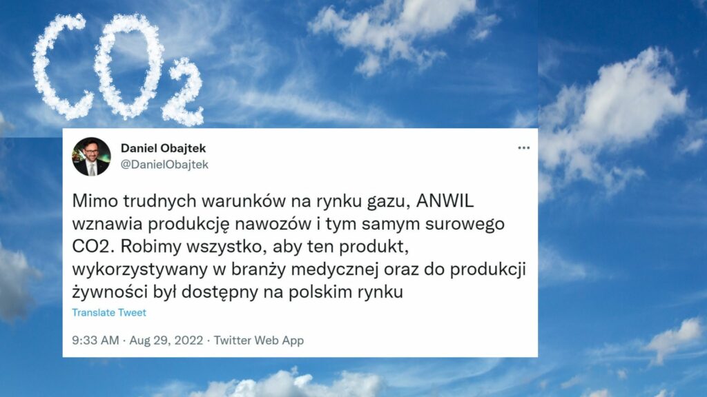 Mimo trudnych warunków na rynku gazu, ANWIL wznawia produkcję nawozów i tym samym surowego CO2. Robimy wszystko, aby ten produkt, wykorzystywany w branży medycznej oraz do produkcji żywności był dostępny na polskim rynku – poinformował Daniel Obajtek, prezes PKN Orlen, na swoim Twitterze. O wznowienie produkcji apelowały organizacje branżowe przemysłu spożywczego i farmaceutycznego.
